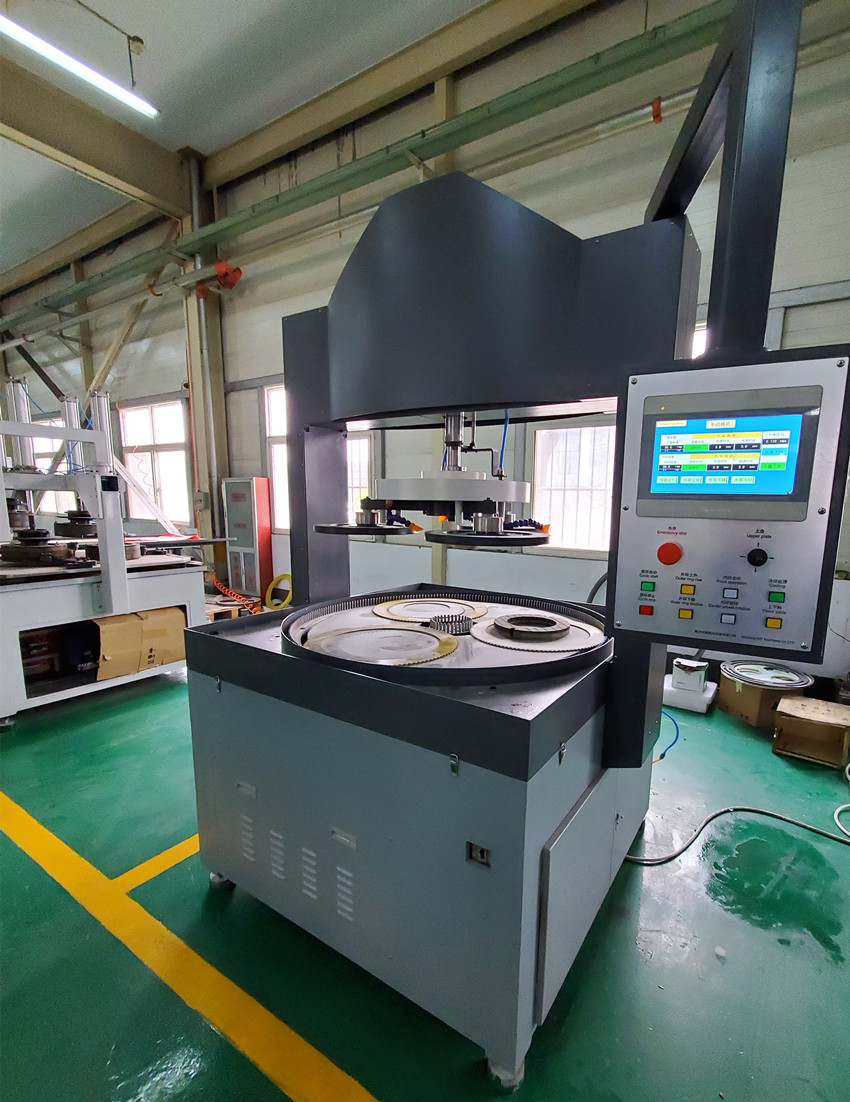 1. 氣動(dòng)加載式研磨機(jī), 上下料時(shí)氣動(dòng)搬運(yùn)壓盤,也可根據(jù)加工要求對(duì)工件施加額外壓力。